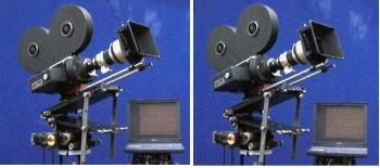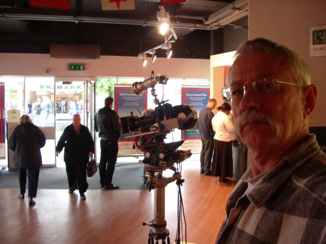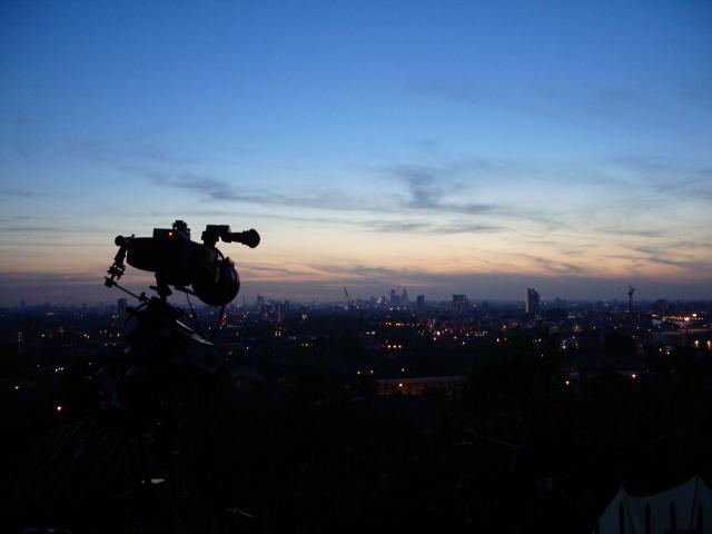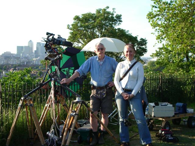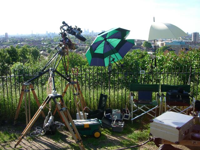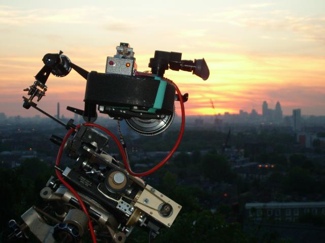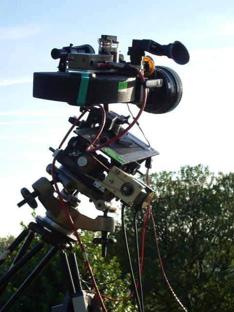 This is the Moy 10" Geared head with stepper motors controlled by PC software. The camera is mounted horizontally in an equatorial position to capture an unusual view over London of the sunset. Equatorial position means that the axis of rotation of the pan is parallel to the axis of the earth. In this instance the motor is driving it at the same speed as the rotation of the earth. The camera is an Eclair ACL with a stepper motor for timelapse. The camera motor has a PIC onboard to control the intervals which are programmed through a serial port. The camera has a 35mm anamorphic lens. We shot ten minutes of film in five hours keeping the sun in centre of frame throughout from twoand a half hours before sunset to two and a half hours after. The aperture is controlled by a servo with that yellow round gear on the lens. The servo is controlled by a light dependant resistor on the end of a lead so it can be pointed to a suitable target so as to track the general light level falling. |